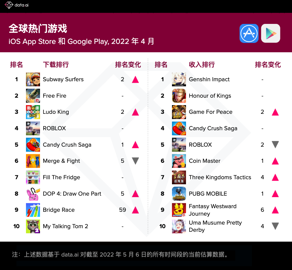 依据 data.ai 的预算数据,在 4 月全球抢手游戏榜中,《Subway Surfers》作为一款已发行 10 年的经典游戏排名上升两位,夺得下载榜冠军。受印度玩家欢迎的本乡休闲游戏《Ludo King》下载量环比增加 16%,挺入前 3 名。由 Supersonic 发行的超休闲游戏《Bridge Race》作为爆款,直接跃入前 10。