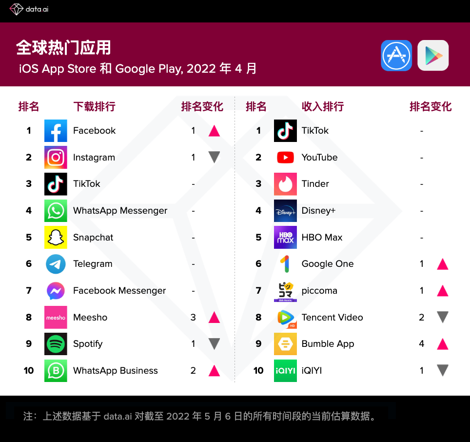 4 月全球抢手使用下载榜单中,Facebook 凭仗其在印度区域的强势体现,重回第一。印度本乡电商渠道 Meesho 也上升 3 名来到第八的方位。一起 WhatsApp Business也相同凭仗印度商场初次进入榜单前十。