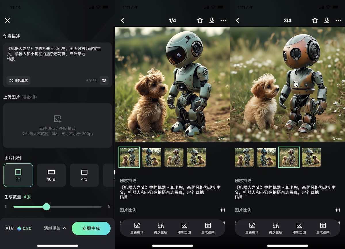 图片生成的作用全体令人满意,在修改时可选一次性生成 1-9 张相片,这方面灵活性强于即梦 AI、微软 Designer 等 AI 生图东西。