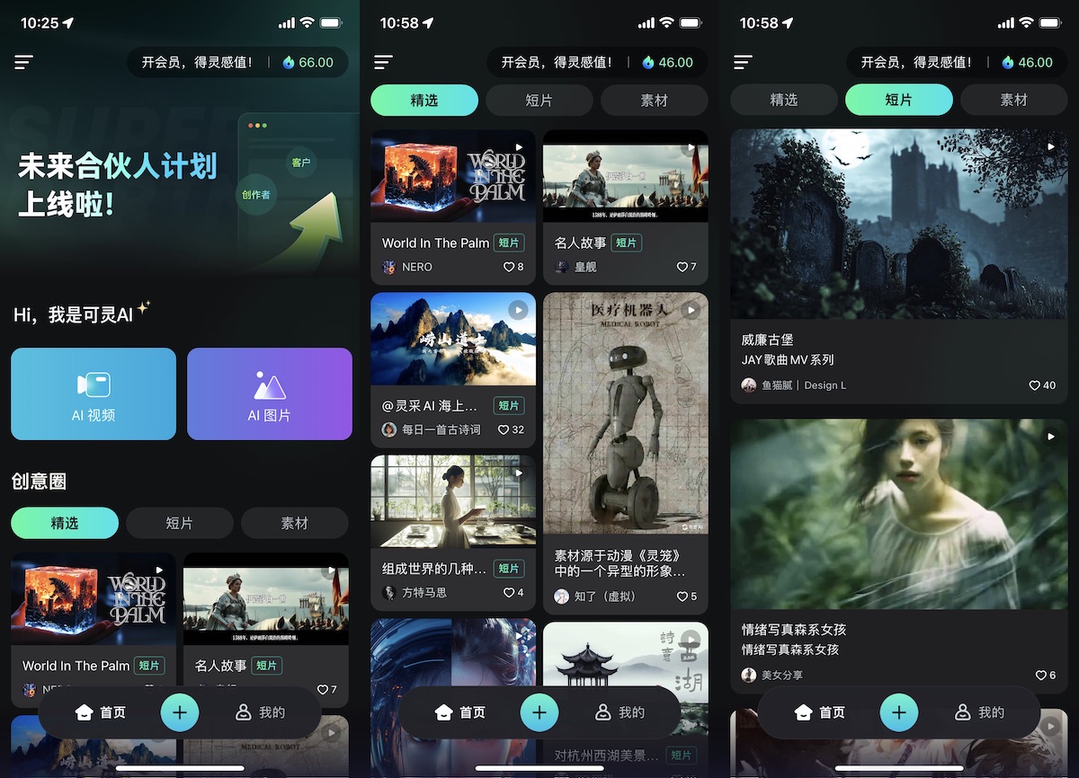 可灵 AI App 现在供给两大功用:AI 视频与 AI 图片。App 界面选用极简风格,在主页夺目方位或点击底部加号均可发动相关功用。持续上划还能看到用户社区发明的短片、资料内容。用户亦可自行发布著作,互动方法现在仅有点赞。