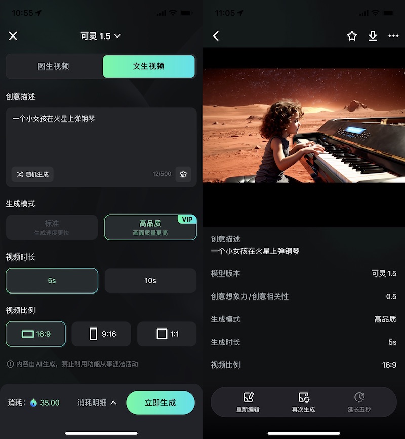 描绘为“一个小女子在火星上弹钢琴”,生成等待时刻 10 分钟。App 截图如下: