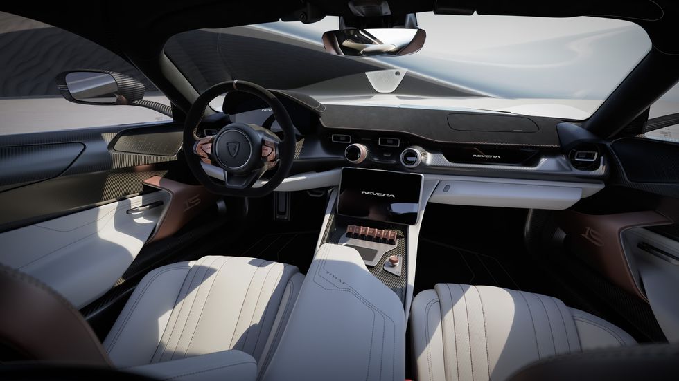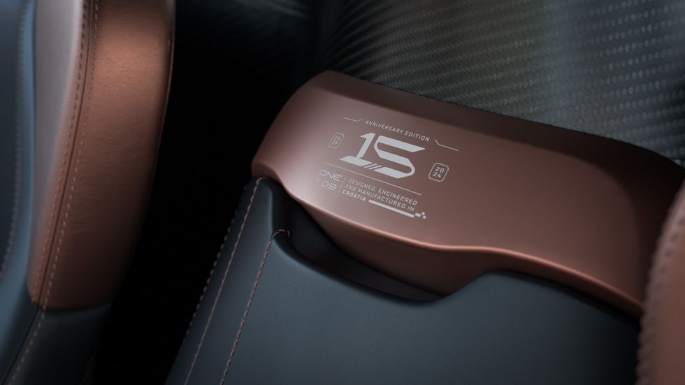 15 周年纪念版 Nevera 的内饰相同选用了庆典主题,具有铜质阳极氧化开关设备和铜漆外表。扶手上装饰有“one-of-9”和“2009-2024”字样,以标识这款特别版的共同身份。车舱内部可选择斗胆的黑色或纯白色,座椅选用比照明显的铜色皮革,并在头枕上印有“15”字样。购买这款车型的客户还将获得与 Nevera 内饰相匹配的定制行李箱,价格为2,350,000欧元,包含一切选配。
