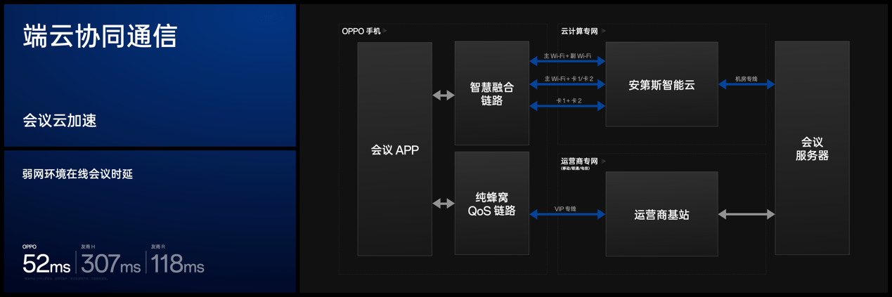 OPPO独有的才智通讯技能运用安第斯智能云供给的智能核算服务,职业抢先的才智交融链路技能,并结合跨层数据加快才能,完结Wi-Fi和蜂窝多网络组合的加快战略。此外,依据通讯QoS链路技能,OPPO经过三大运营商5G精品专网的树立,完结对会议数据进行加快,改进会议时延。