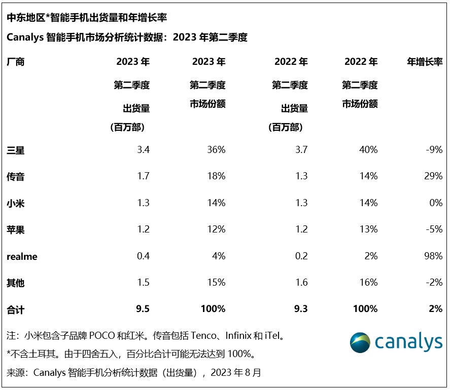 依据Canalys发布的最新数据,2023年第二季度,各厂商在中东(不含土耳其)的智能手机出货量达950万部,年添加2%,而全球商场同期下降10%。全球油价上涨、区域失业率创前史新低、非石油范畴扩张以及和海外投资涌入等多方面的推进下,该区域的经济状况有所改善。