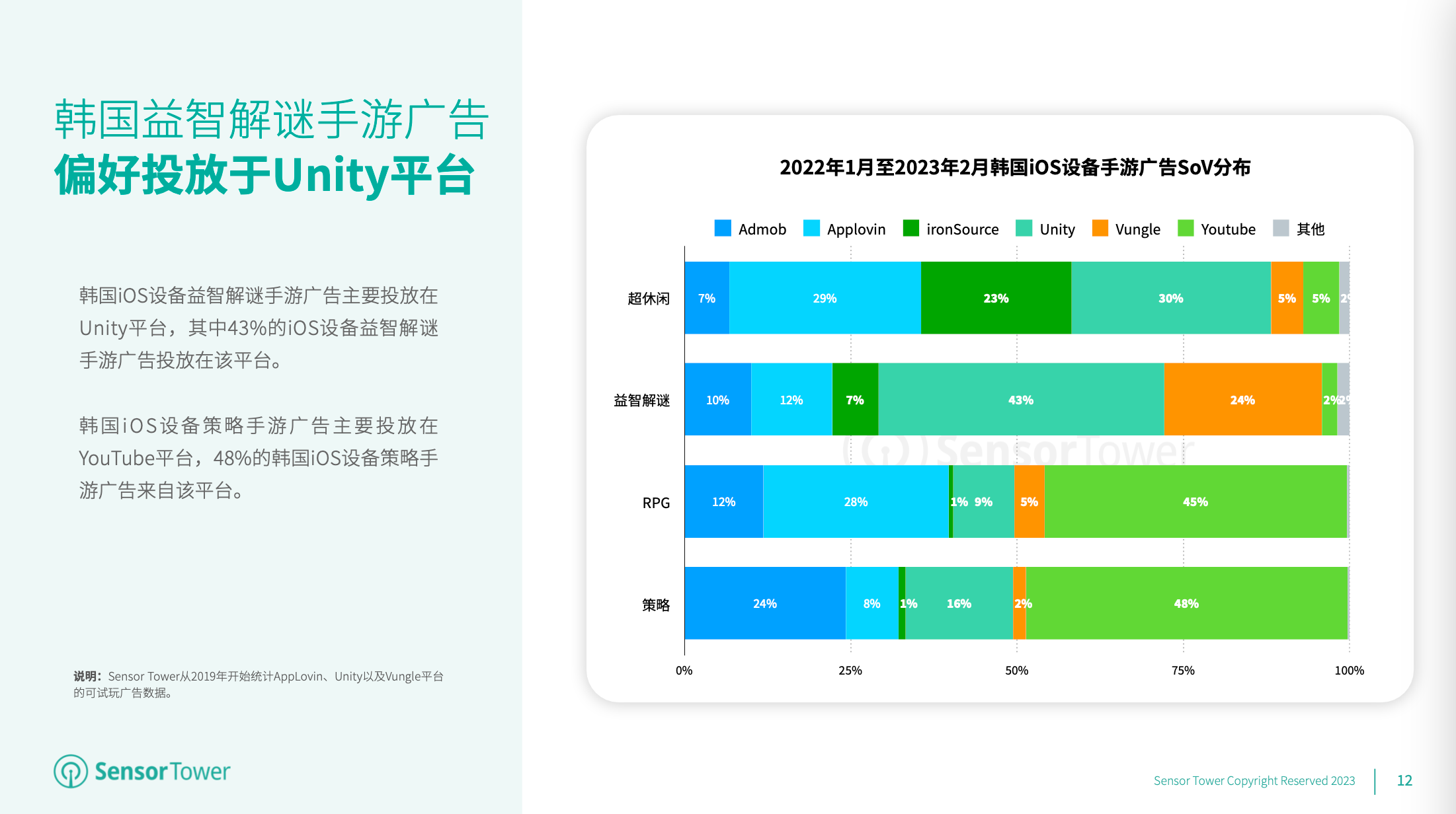 2022年1月至2023年2月,全球iOS设备手游广告首要投进在AppLovin、Unity、Admob和YouTube等渠道,其间近27%的iOS设备手游广告投进在AppLovin渠道。安卓设备手游广告会集投进在Unity渠道,该渠道贡献了高达88%的全球安卓设备手游广告。