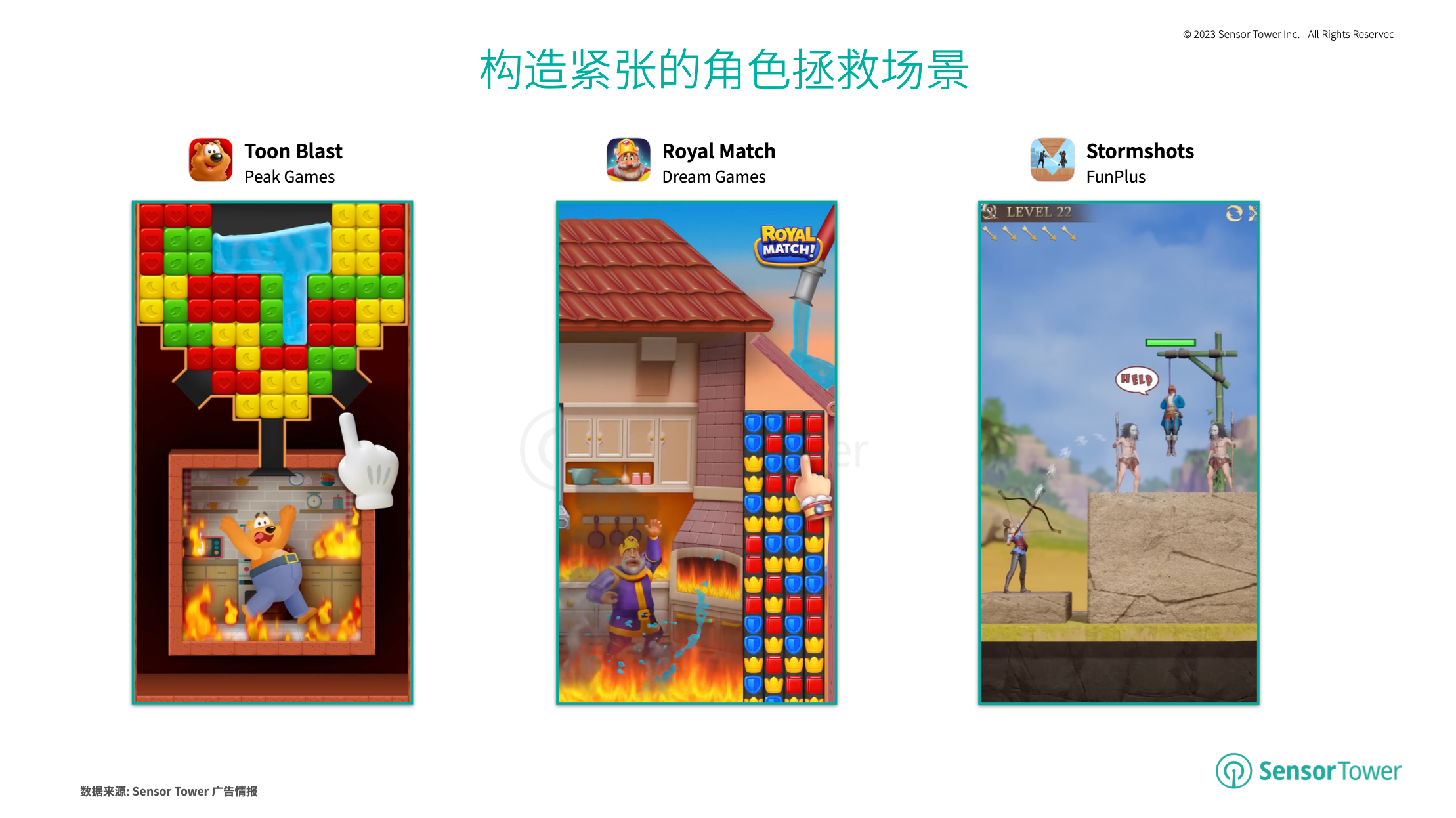 Peak Games砖块消除手游《Toon Blast》、Dream Games经典三消手游《Royal Match》和FunPlus 4X战略手游《Stormshot》广告资料均经过结构严重的人物解救场景,召唤玩家参加游戏。Sensor Tower商铺情报数据显现,《Royal Match》是2022年全球收入增加最大的益智解谜手游。
