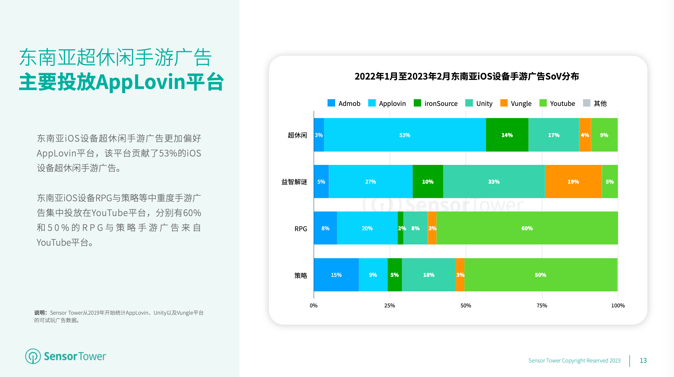 东南亚iOS设备超休闲手游首要投进渠道是AppLovin,其SoV高达53%。