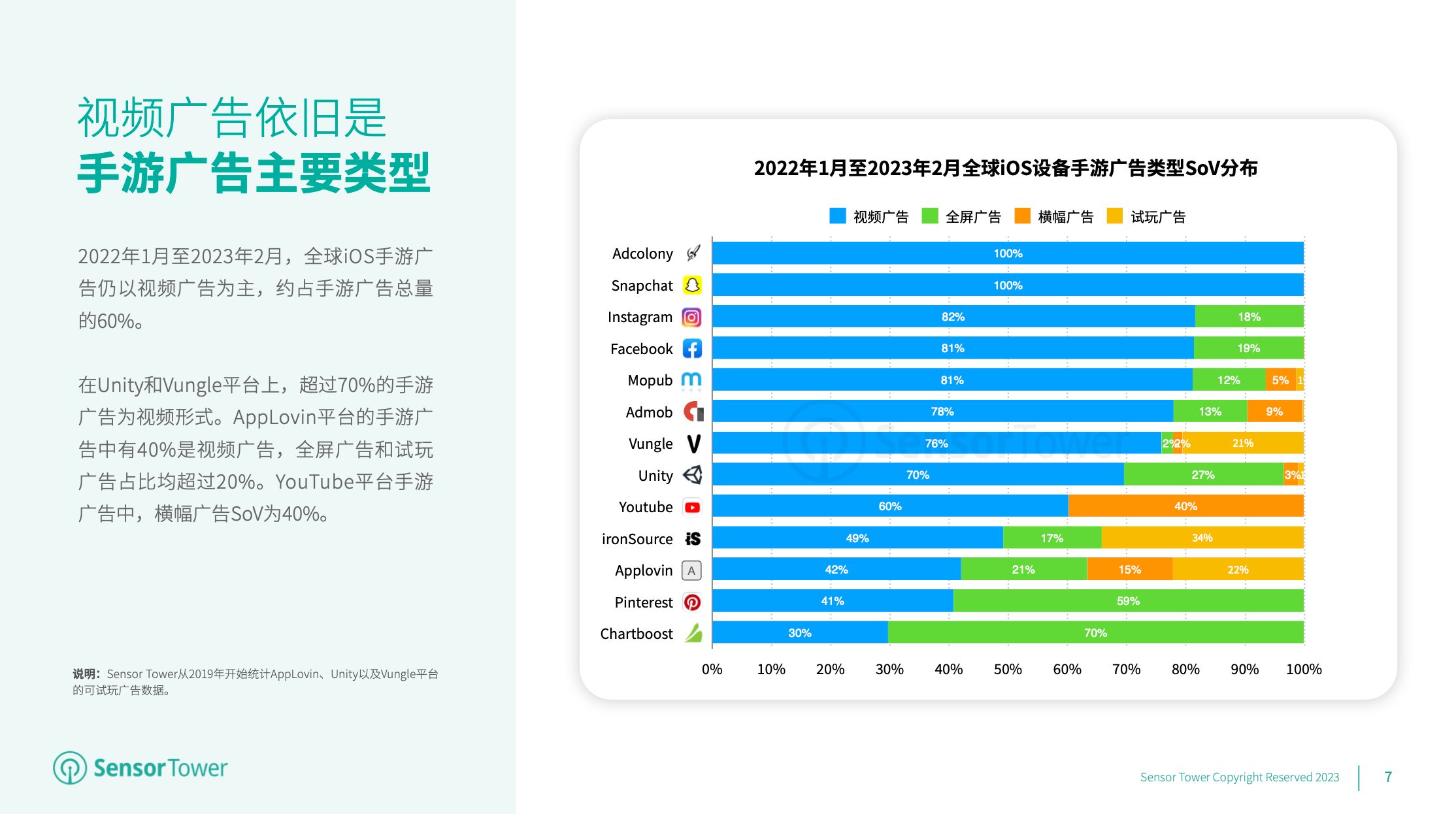 全球手游广告仍以视频广告为主,2022年1月至2023年2月期间视频广告约占iOS设备手游广告总量的60%。就不同渠道而言,Unity和Vungle渠道上超越70%的手游广告为视频方式,AppLovin渠道全屏广告和试玩广告占比均超越20%,YouTube渠道横幅广告SoV达40%。